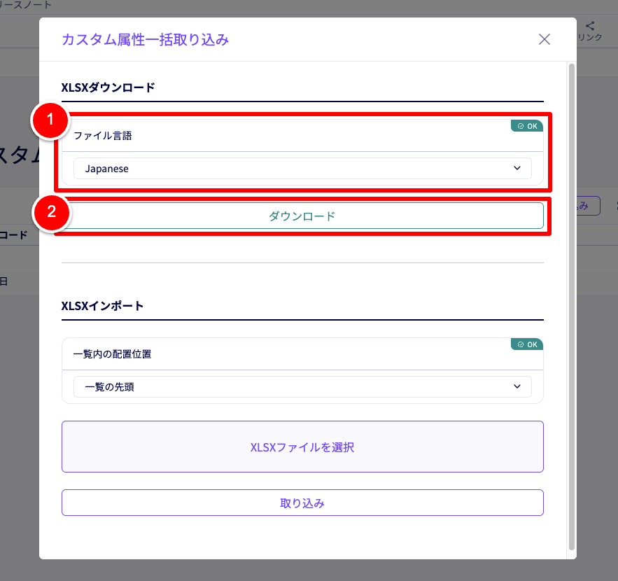 - カスタム属性一括取り込み用XLSXファイルをダウンロードする