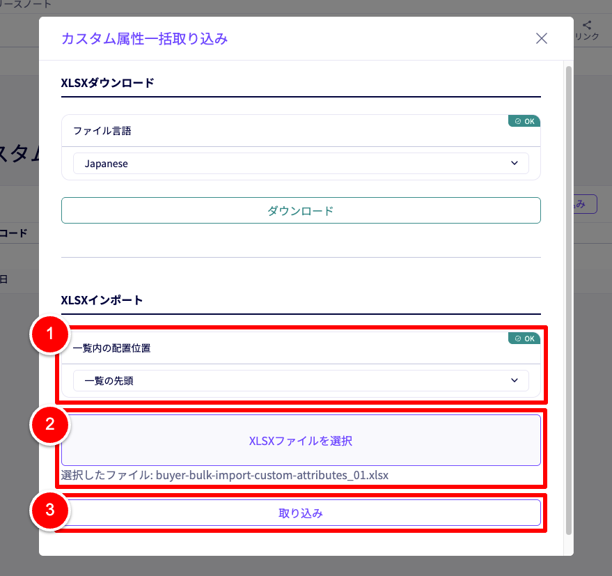 編集済みのカスタム属性一括取り込み用XLSXファイルを選択します。 - 取り込み ボタンをクリックします。