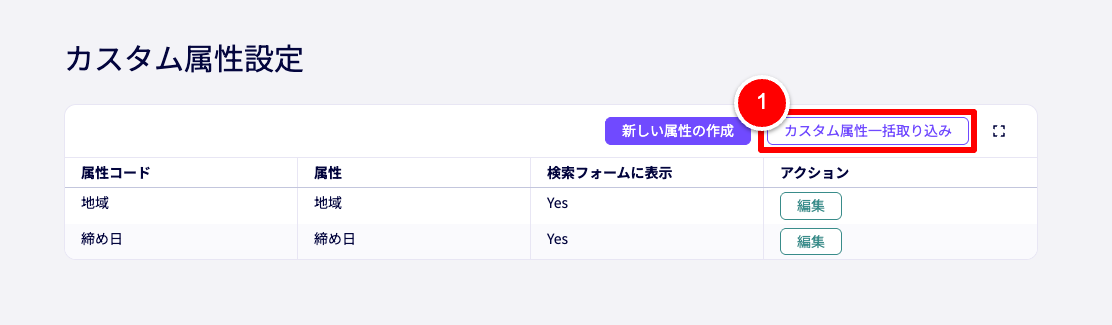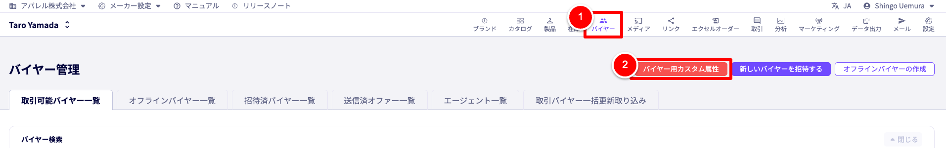 - 画面右上の バイヤー用カスタム属性 ボタンをクリックします。