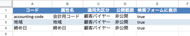 を指定することで、バイヤー用 のカスタム属性の一括取り込みが可能なため。 - D列:
