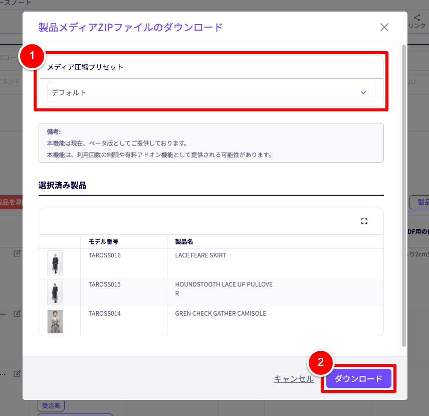 製品に登録された画像データ・動画データを、Zipファイルにまとめてダウンロードすることができます。
