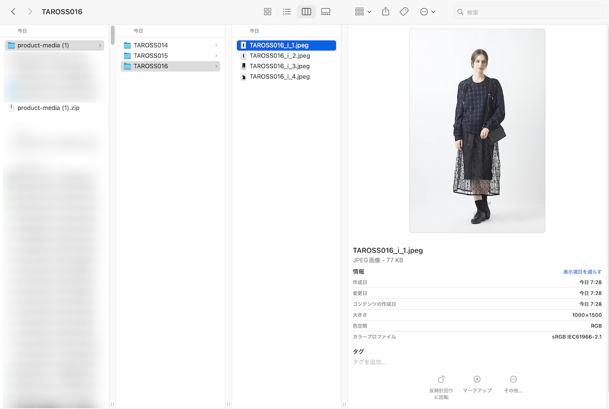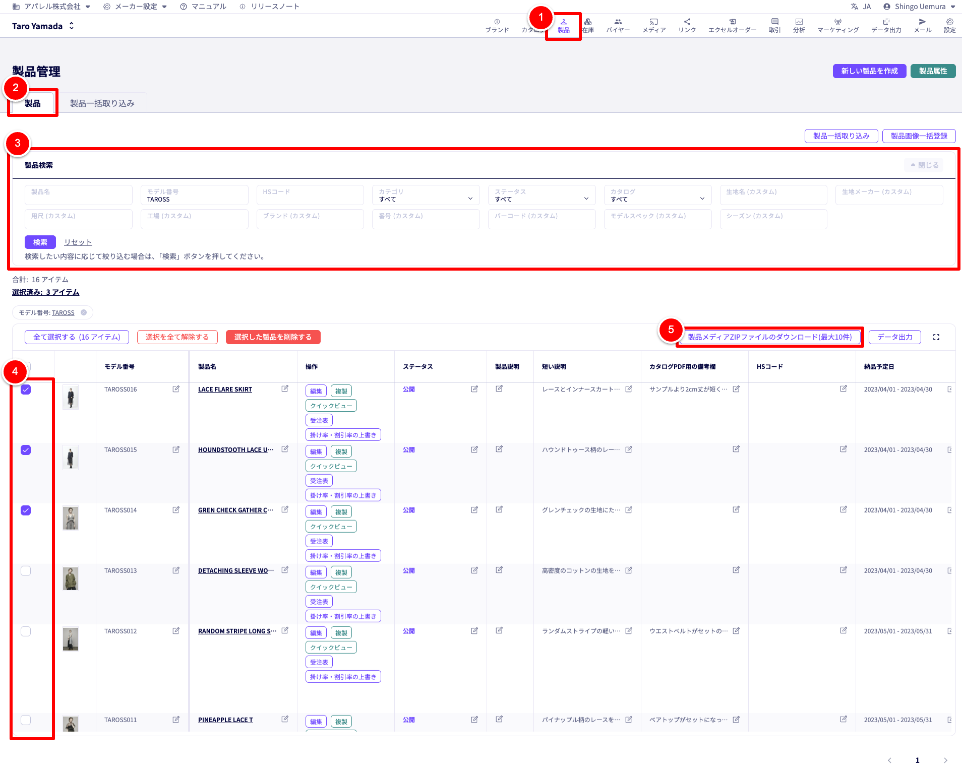 製品に登録された画像・動画データをローカル環境に保存し、データのバックアップを取得できます。Zipファイル内では、製品の モデル番号 ごとにフォルダで分類されるため、1製品ごとに整理された画像・動画フォルダを入手することが可能です。 - バイヤーへの製品メディアの共有