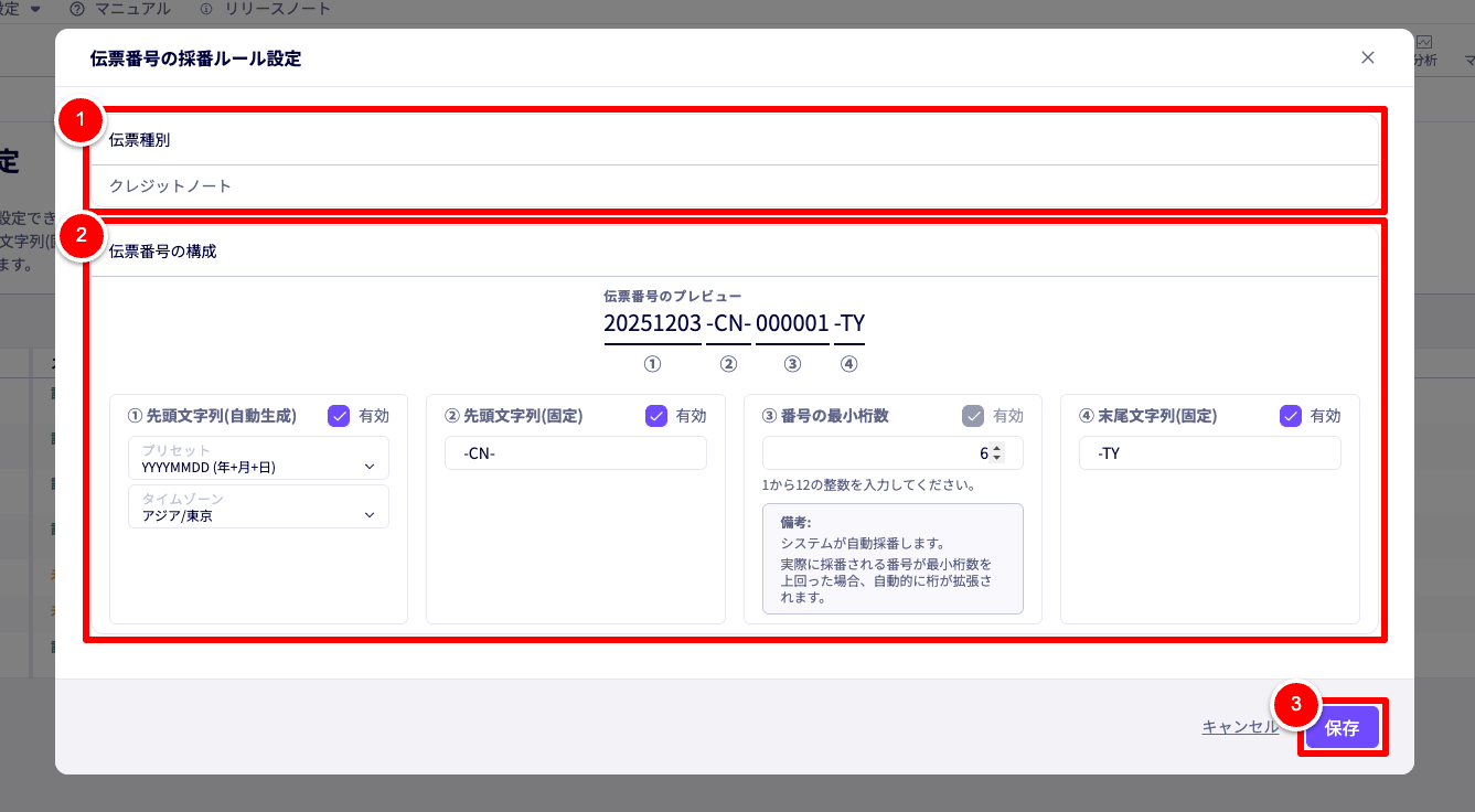 採番ルールを設定すると、取引伝票作成時に発行される伝票番号が、設定された採番ルールに基づいて生成されるようになります。