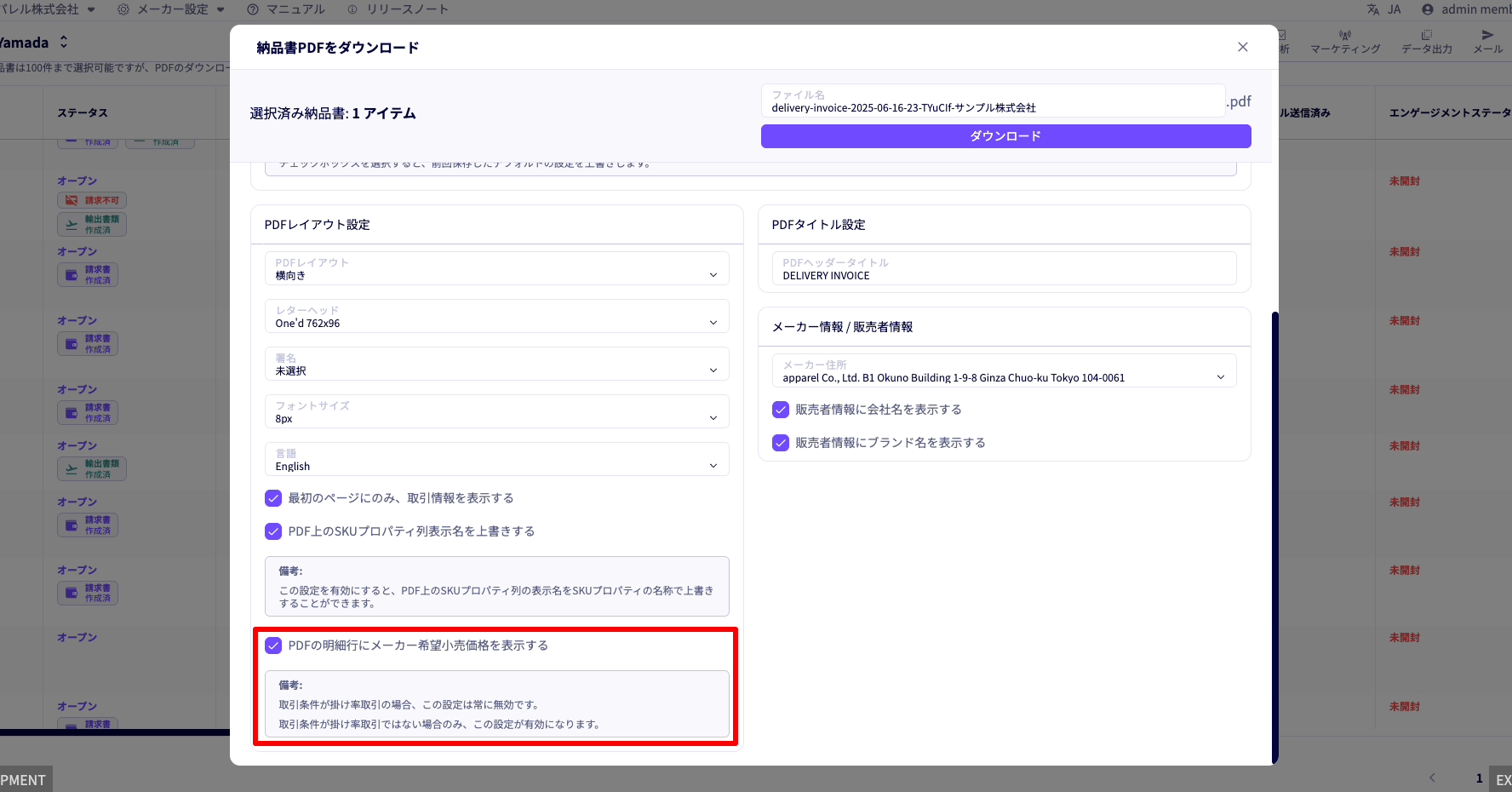 「納品書PDFをダウンロード」操作画面の「PDFレイアウト設定」内に、「PDFの明細行にメーカー希望小売価格を表示する」というチェックボックスが新しく追加されています。