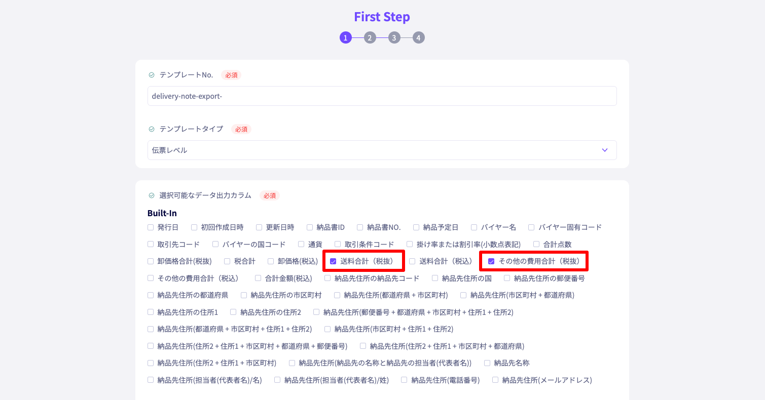 メーカーアプリの「納品書データ出力(テンプレート利用)」機能において、選択可能なデータ出力カラムに以下の新しい項目を追加しました。